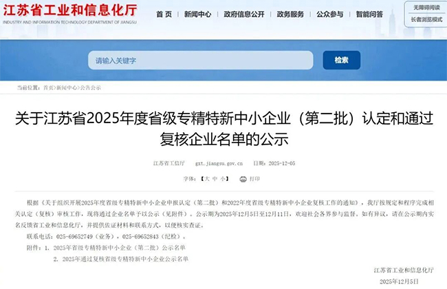 近日,江苏省工业和信息化厅正式公示了江苏省2025年度省级专精特新中小企业(第二批)认定和2022年度省级专精特新中小企业通过复核的企业名单,918博天堂·[中国]官方网站 (以下简称“918博天堂”)凭借在工业废水处理深度回用与资源化利用领域的卓越技术创新能力、显著的市场竞争优势以及突出的行业引领示范作用,成功通过此次复核,再次荣膺“省级专精特新中小企业”称号。标志着公司在专业化、精细化、特色化、新颖化发展道路上迈出了更为坚实的一步,也意味着918博天堂长期深耕废水处理环保领域所取得的成果获得了权威认可!